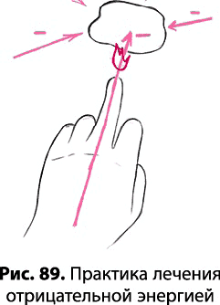 Сначала мы с силой закладываем отрицательную энергию примерно в то место, где находится опухоль. Затем направляем средний палец левой руки на центр новообразования и резко сбрасываем отрицательную энергию со сжиганием семь раз подряд. Палец должен быть все время направлен на очаг поражения (рис. 89).