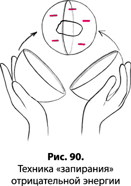 Встаньте напротив пациента и представьте, что на обеих ладонях у вас – по полусфере, зеркальной изнутри. Затем захлопните полусферы вокруг опухоли и завинтите половинки, словно на них есть резьба. Получившийся шар не должен быть слишком маленьким, чтобы в нем хватало места для отрицательной энергии (рис. 90).