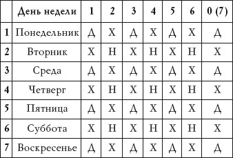 Написать на листе бумаги интересующий вопрос и зачеркнуть в нем все гласные буквы. Под согласными поставить цифры, соответствующие цифрам в алфавите. Полученные цифры перемножить и полученное произведение разделить на 7. Остаток деления соотнести с днем недели (0 – воскресенье, 1 – понедельник, 2 – вторник, 3 – среда и т. д.) и по приведенной ниже таблице получить ответ на вопрос: Д – ответ утвердительный, Н – ответ отрицательный, Х – решение данного вопроса лучше перенести на другой день.