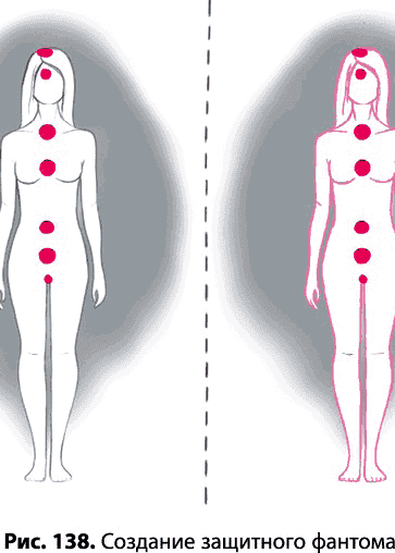Очень желательно строить фантом, видя человека лицом к лицу, хотя это можно сделать и удаленно. Первый шаг – построить энергетический образ человека. Мы визуализируем и ставим рядом с человеком его энергетического двойника. Этот двойник должен представлять собой абсолютную копию человека, его чакр и энергетических оболочек (рис. 138).