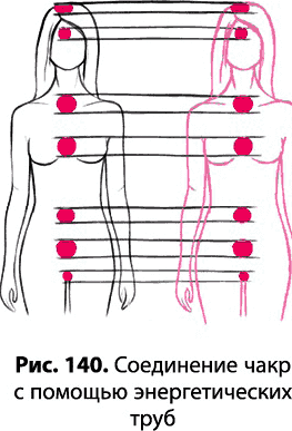 После мы должны подключить все чакры человека к соответствующим чакрам его фантома. Для этого мы соединяем передние входы всех чакр человека с задними входами чакр фантома с помощью энергетических труб (рис. 140).