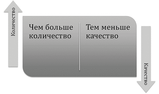 Качество обратно пропорционально количеству. Если анализировать на примере производства продукции, то чем меньше товара, тем он качественнее; и наоборот, чем больше товара и чем больший спрос на него, тем меньше качество.