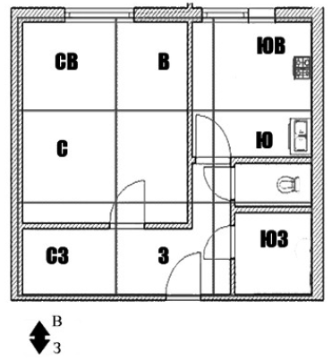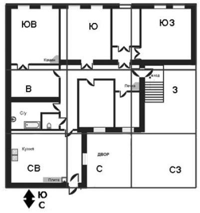 Допустим, вы получили измерение в 350 градусов. Согласно таблице, это Север. Ось, относительно которой дом ориентирован в пространстве – Север-Юг. Записываем в верхнем и нижнем центральных клетках «Север» и «Юг», и далее расписываем все остальные дворцы.