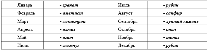 Далее следует перечень драгоценностей, благоприятных для людей, согласно их времени рождения, идут описания свойств и употребления для лечения многих известных драгоценностей и камней.