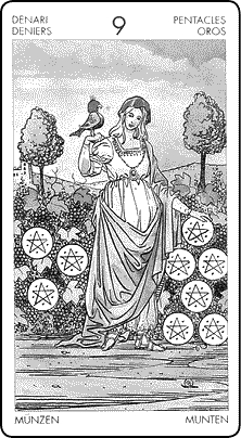 Традиционно Девятка Пентаклей известна как карта материальной прибыли. В астрологии она ассоциируется со вторым десятком градусов Девы, где богиня любви и красоты Венера выращивает свой сад земных наслаждений.