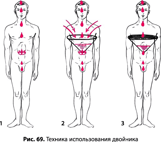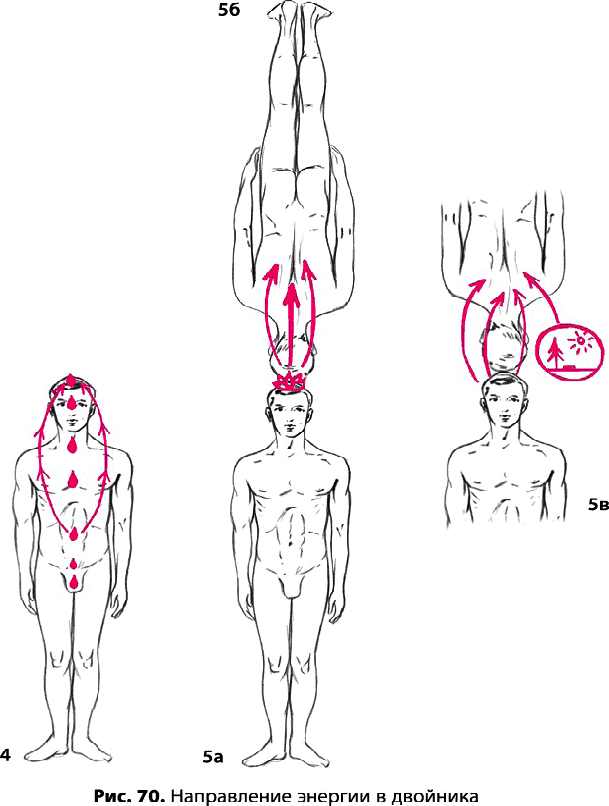 Задание двойнику, точно так же, как и подсознанию, мы даем в форме картинки. На базе конкретного запроса сформируйте в сознании образ того, что вы хотите получить. Вы должны добавить эту картинку к полученной энергии и мощным потоком влить этот «коктейль» в двойника (рис. 70).