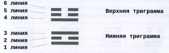 И-Цзин состоит из 64 т.н.. гектарам, которые выглядят как сочетание шести линий. Каждая гексаграмма разбивается на две триграммы — верхнюю и нижнюю.