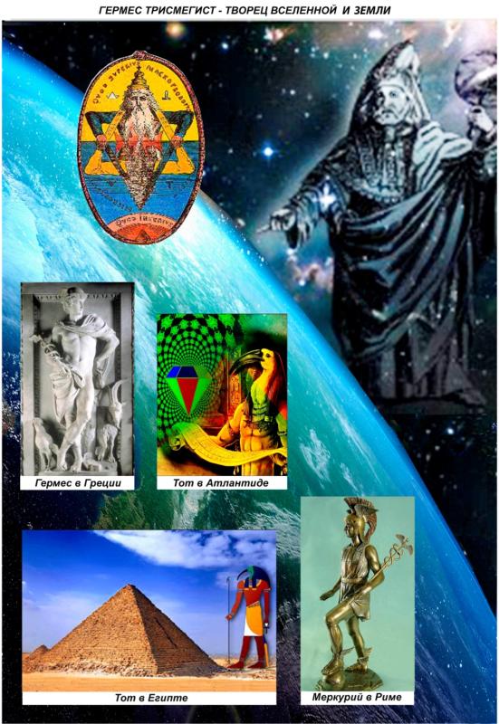 Таким образом, этот Человек, после того, как «ОН СТАЛ БОГОМ». В Атлантиде – «БОГОМ ТОТОМ» (Богом нравственности). В Египте – «БОГОМ ТОТОМ» (Птицей Ибисом – Богом письменности, наук, искусств). В Греции – «БОГОМ ГЕРМЕСОМ» (Вестником Богов, психопомпом – водителем душ в царство мертвых). В Риме – «БОГОМ МЕРКУРИЕМ» (Богом торговли). В конце концов, за свои заслуги в трех мирах Земли: в подземном мире, на поверхности земли и в воздухе, этот Человек – Бог получил имя «ГЕРМЕСА ТРИСМЕГИСТА ТРИЖДЫ-ВЕЛИЧАЙШЕГО». И стал ЗЕМНОЙ ЧЕЛОВЕК – СМЕРТНЫМ БОГОМ, А НЕБЕСНЫЙ БОГ – БЕССМЕРТНЫМ ЧЕЛОВЕКОМ. (Гермес Трисмегист)
