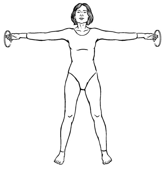 Это упражнение стимулирует мышцы верхней части рук и верхней спины («крылья»). Вытяните прямые руки в обе стороны и вращайте ими по маленьким окружностям в одну сторону, постепенно увеличивая окружности. Затем поменяйте направление и повторите упражнение. Вы можете также (в соответствии со стихией воздуха) представлять, что вы хлопаете своими руками, как крыльями, и летите, делая при этом глубокие, глубокие вдохи (рис. 5.9).