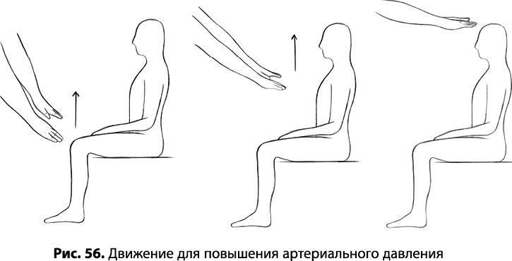 Пациент должен находиться в положении сидя. Немного опустите руки, поверните ладонями вниз и направьте средние пальцы в сторону его колен. Медленно проведите руками снизу вверх вдоль его тела, к голове. В конце движения поднимите их параллельно над головой, разведите в стороны и сожгите энергию. Сделайте пять движений и померьте давление. Чтобы движение было более эффективным, нужно выполнять его продуманно. Ставя руки в исходную позицию, мы должны прочувствовать энергию человека (рис. 56).