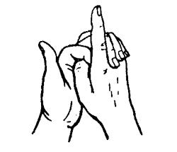 Методика исполнения: средний и безымянный пальцы, а также мизинцы правой и левой руки скрестить. Мизинец правой руки должен находиться снаружи. Выпрямить указательный палец левой руки. Выпрямить большой палец левой руки. Согнуть указательный палец левой руки, и прижать его к основанию указательного пальца правой руки. Большой палец правой руки согнуть и поместить под согнутый указательный палец левой руки.