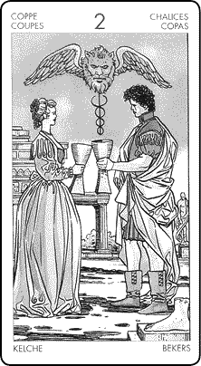 В астрологии Двойка Кубков ассоциируется с первыми десятью градусами Рака, где Венера, богиня любви, помогает молодым влюбленным создать счастливый новый дом вместе.