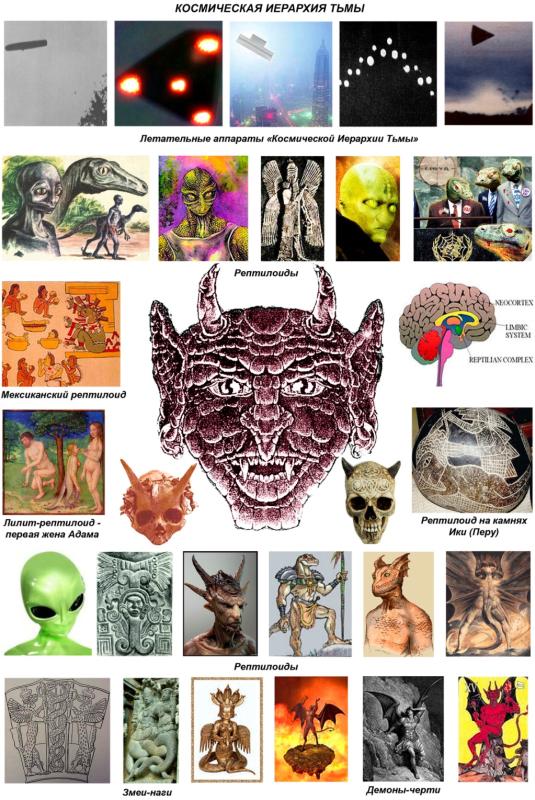 КРАТКАЯ ИСТОРИЯ ФОРМИРОВАНИЯ «КОСМИЧЕСКОЙ ИЕРАРХИИ ТЬМЫ» НА ЗЕМЛЕ. Как упоминалось ранее, «Люцифер-Сатана со своими падшими Ангелами» появился на Земле при создании «3-й лемурийской коренной расы человечества», когда он стал помогать «Светлым Богам» строить «плотное тело лемурийского человека». Это было в эпоху динозавров в интервале от 250 млн. до 65 млн. лет назад. В это время, согласно карме и реинкарнации, «лемурийский человек», проходя эволюцию в «мире животных», не всегда переходил на следующую ступень выше в «мир человека», а иногда застревал в бесконечной «сансаре – рождении и смерти», и снова рождался в «мире животных». Этим воспользовался «Люцифер-Сатана со своими падшими ангелами», и они создали «ГИБРИДЫ – МОНАДЫ (ДУШИ) ЧЕЛОВЕКА С МОНАДАМИ (ДУШАМИ) ОКРУЖАЮЩИХ ЖИВОТНЫХ». А окружающими животными в этот период были «ДИНОЗАВРЫ». Вот так и получились «РЕПТИЛОИДЫ – ГИБРИДЫ ЧЕЛОВЕКА И ДИНОЗАВРА». Как мы помним из библейских сказок «первой женой Адама была Лилит с драконьим хвостом». К тому же сам «Люцифер-Сатана и его падшие Ангелы» прибыли на Землю из миров, где эволюция разума шла из «драконоподобных рептилий», создававших «рептилоидные цивилизации», лишенные идей гуманизма, любви, сострадания, милосердия.