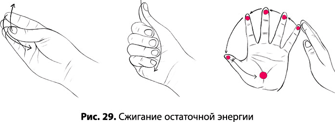Для того чтобы сжечь остаточную энергию, мы проводим подушечками четырех пальцев, от мизинца до указательного, по всей длине большого пальца. Таким образом мы ведем от подушечки большого пальца к основанию теми местами, где расположены второстепенные чакры.