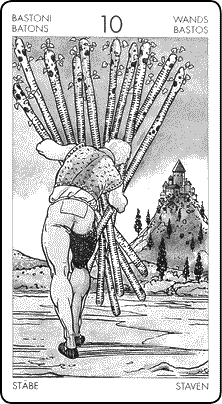 Очень легко каждому узнать себя в Десятке Таро. Каждый чувствует себя переутомленным, обремененным и даже согнувшимся под тяжестью повседневных обязанностей, мыслей и забот.