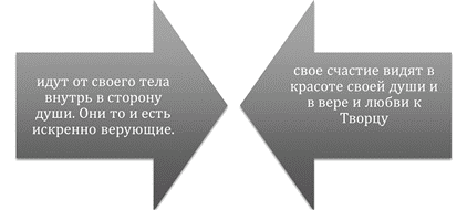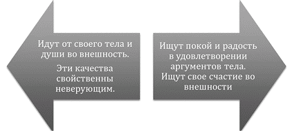 В принципе всех людей можно разделить на две категории: первая ориентирована только на внешность и выбрала себе путь идти вне себя (от себя), и вторая группа людей, которые выбрали путь идти внутрь себя, т. е. в сторону души. Первая выбрала аргумент тела, а вторая – аргумент души. Первая выбрала неверие, а вторая – путь поклонения и веры.
