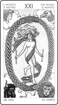 Окруженная гирляндой славы (миром без начала и конца) молодая женщина сбросила все свои комплексы вместе с одеждой. А возможно, она даже воскресла (некоторые специалисты Таро полагают, что покров, закручивающийся вокруг нее, в действительности является саваном – традиционно закручиваемым по спирали полотном, в которое заворачивали усопшего). По углам карты расположены четыре неизменных создания зодиака, которые в последний раз появляются в Старших Арканах.