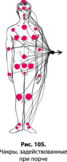 При этой порче у человека могут быть задействованы от одной чакры до всех, кроме чакр на концах пальцев рук и ног. Энергия из задействованных чакр уходит вбок. Сбоку выходы от чакр связываются в узелок. Порча может быть как на одной чакре, так и на всех, кроме первой и последней (рис. 105).