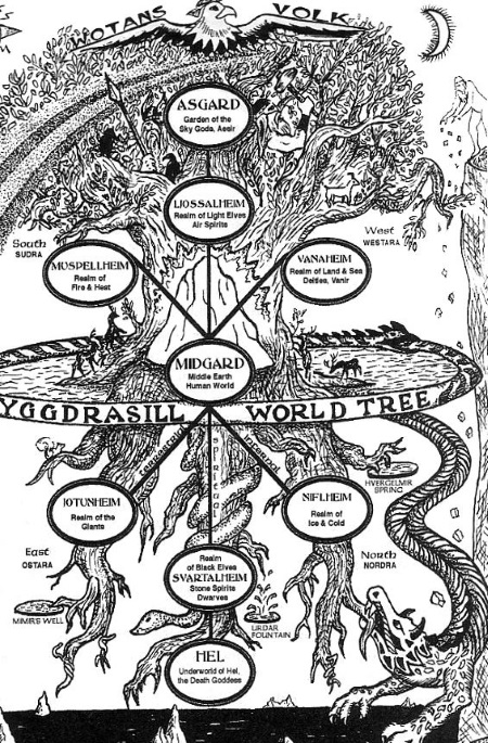 Нифльхейм, Обитель Тумана, холодный и мрачный ледяной мир, где живут ледяные великаны. Между этими двумя мирами проходит ось ось миров, за свою форму прозванный Мировым Древом, Иггдрасиль.