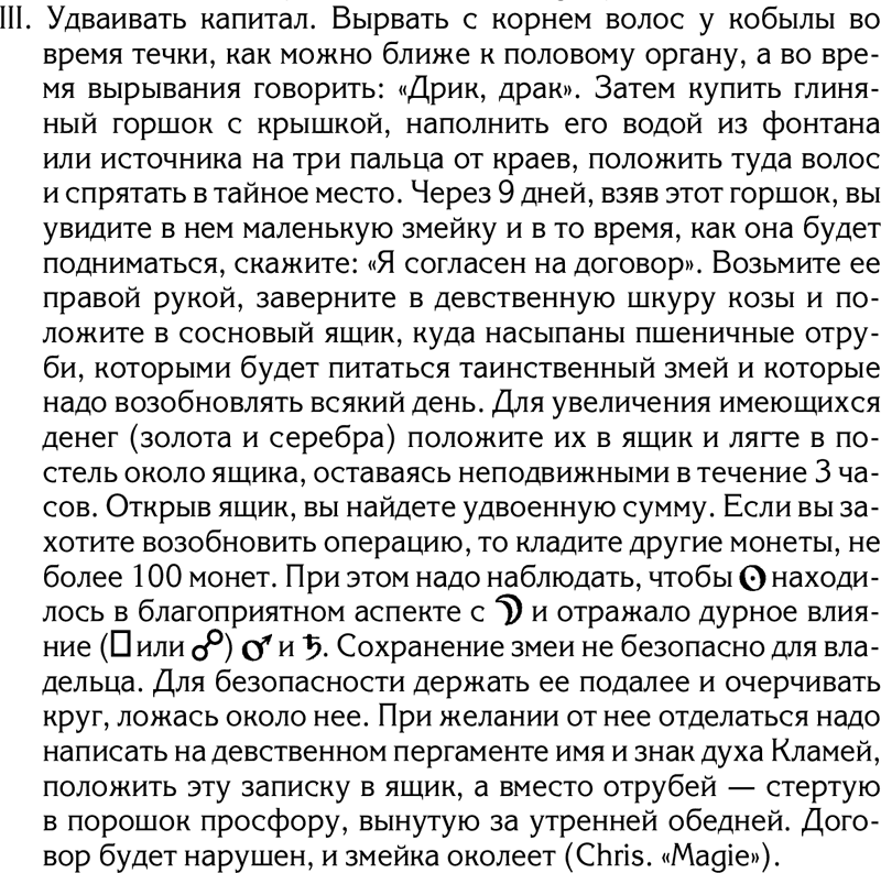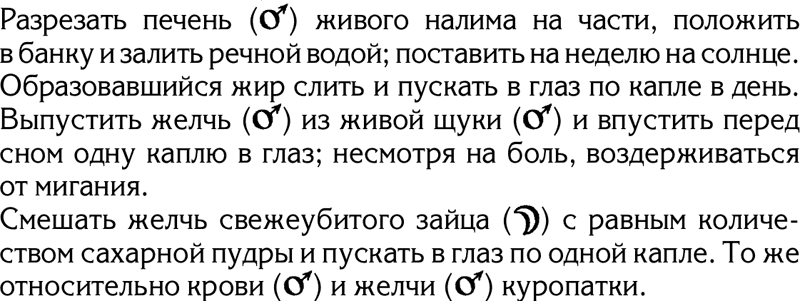 «Если накурить льняным семенем, пселием (pselium), корнем фиалки, сельдереем (apium); в источнике сказано: дикая петрушка – узнаешь будущее, а чтобы прогнать дурных духов и вредных привидений, надо сделать курение из каменной мяты (melisse calamintha), пиона (paeonis of.), мяты (mentha) и клещевины обыкновенной (ricinus palma christi). Сжигая кости глотки оленя – можно собрать окрестных змей, а чтобы их прогнать – зажечь рог того же оленя. Копыто правой ноги лошади или мула, сожженное в доме, прогоняет мышей, а с левой ноги – мух. Если составить курение из желчи Каракатицы (cepia), розы (thymiamas), дерева алоэ, и брызгать в него водой с кровью – дом покажется полным воды или крови, а бросить на него вспаханную землю – покажется, что земля дрожит (Migne). См. Курения.