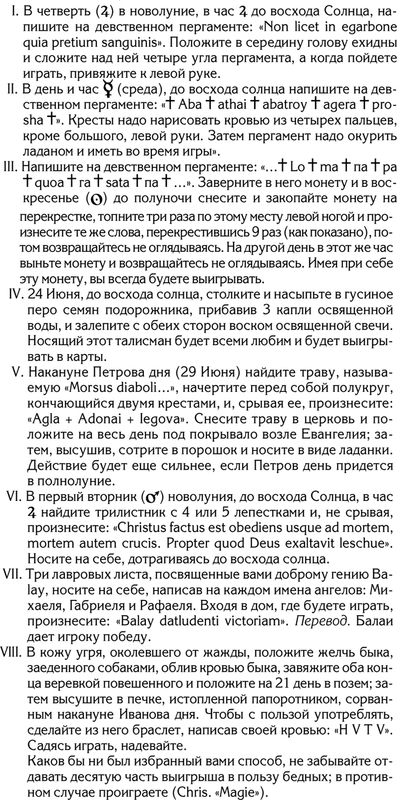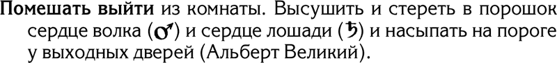 Боли не ощущать при пытке или операции. Проглотите записку, четко написанную вашей кровью: «Aglas Aglanas Agladena imperubies meritis tria pendent corpora ramis dismeus et gestus in medio et diwina potestas dimeas clamator, sed jestas astra levatur» или «Tel Bel Quel Caro Mon Aqua» (Агриппа. – «Ocuv. Mag.»).
