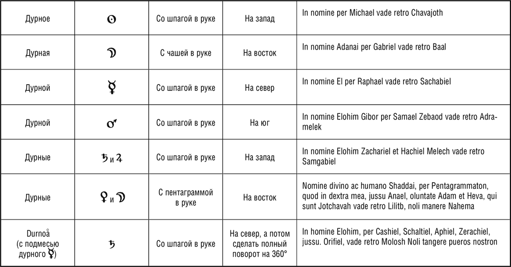 Агла, Он, Пентаграмматон, Он, Атанатос, Агратон, тета тутус. Бог Авраама, Бог Исаака, Бог Иакова, взгляни на твоего слугу (имя), готового защищать Твое имя; прикажи ангелам твоим помогать мне и не покидать меня в моих начинаниях и через Тебя, о Боже, Атанатос, Ариос, Ариос, Ариос, Альфа и Омега, Ангелы Кассель, Сахиель, Самаель, Анаель, Рафаель, Михаель и Габриель пусть придут и помогут мне во всех моих делах, никогда меня не покидая, и чтобы силою открытого Тобою отцу моему искусства они были мне верны и послушны Твоему святому имени Тетраграмматон (Ключ. Солом.).