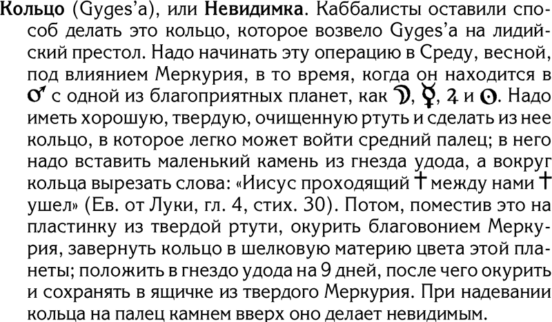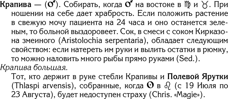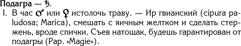 Предлагаемое средство так просто и удобоисполнимо, даже для лиц со скромными так средствами, что, вероятно, найдутся люди, пожелающие его испытать. Сочинение Кролиуса изобилует такими несравненными рецептами, заимствованными по большей части от Парацельса, которого он один из немногих в состоянии понять. Все его указания отличаются ясностью и не требуют сложных приборов. Что касается настоящего рецепта, то должно заметить, что Сатирион или скорее Ятрышник (Orchis), которого несколько видов, имеет корень, представляющий два клубня. Стебель выходит от одного из них, становящегося от этого вялым и мягким (flappe) и могущего служить для совершенно противоположных целей (А. В. Т.). См. Лошадь.