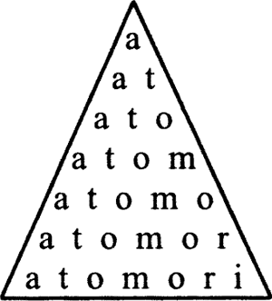 Рах-де-Байиф, со слов Серена Самосского, говорит, что это слово, написанное в виде конуса, обращенного вершиной вниз, при условии отнятия по одной последней букве целебно действует против болезней для лица, носящего его на себе. Магический треугольник христианских теософов есть знаменитая «абракадабра», которому они приписывали необыкновенные свойства. Эта комбинация буквы является ключом пентаграммы. Начальное «а» повторено здесь 5 раз, а всего 30 раз, что дает элементы и числа следующих двух фигур: