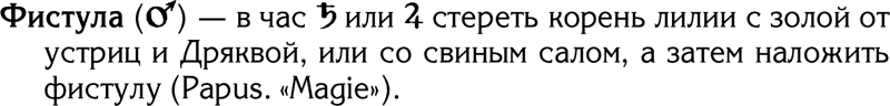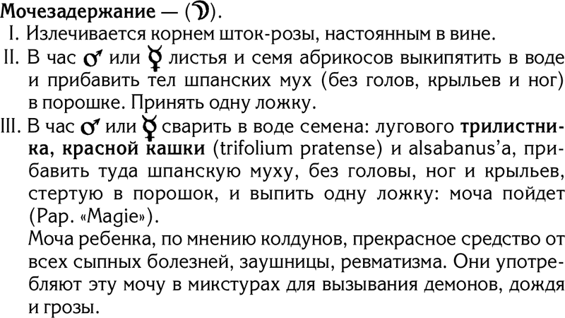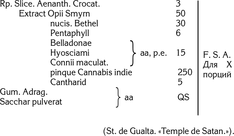 Мазь для шабаша. Смеси с Гиосциамусом играли тут большую роль: считали, что Hyosciamus niger (белена) соединяет в себе качества, полезные колдуну (Utile dulci suaviter miscendo, то есть полезное должно быть приятно в смеси со сладким.) Что же касается до снадобья для внутреннего употребления, то мы приведем в качестве курьеза следующий рецепт, в скором и верном действии которого мы уверены. Но мы никому не советуем пробовать его и, означая пропорцию, мы все-таки остережемся указать дозу.