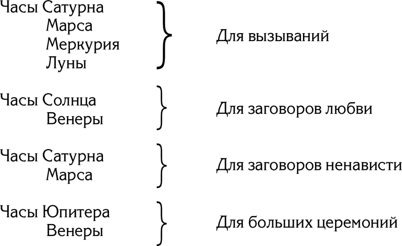 Их применяют при религиозных и магических операциях; так как благовония приятные привлекают чистых духов, то колдуны по аналогии для вызова злых духов отдают предпочтение смрадным курениям Сатурна, которые составляют, по словам Эл. Леви («Rituel», с. 119). Диагридим (скаммониева смола с айвовым или сладкокоренным соком), Скаммония (смола растения convolvulus scammonia), Квасцы, Сера, Асса-фетида.