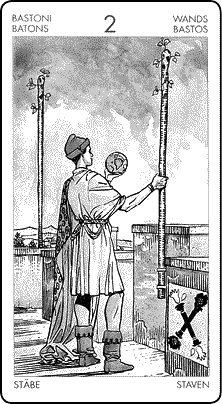 Традиционно Двойка Жезлов известна как карта господства. Хорошо одетый деловой человек, изображенный на карте, вполне соответствует этой роли: он наделен властью, чтобы доминировать и владеть – всем тем, что он внимательно осматривает, контролирует. Взгляните: он буквально держит весь мир в своих руках.