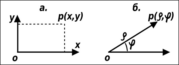 Рис. 7. Системы координат на плоскости: а) прямоугольная система; б) полярная система