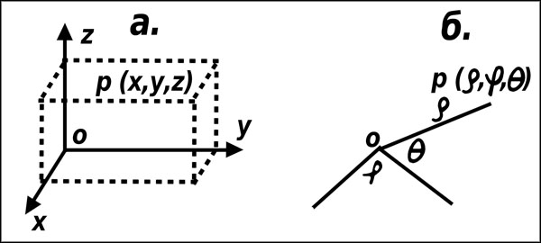 Рис. 8. Системы трехмерных координат: а) прямоугольная система; б) сферическая система