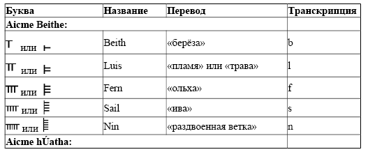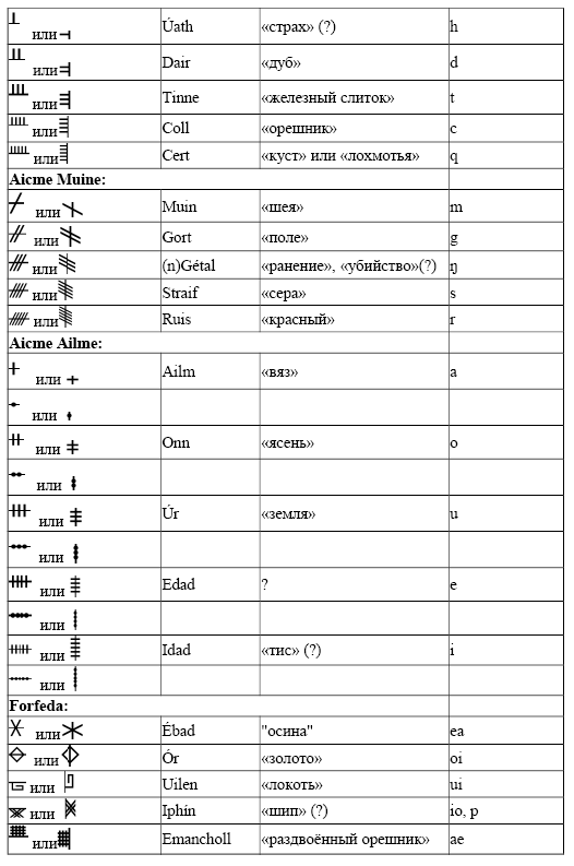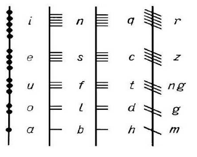Алфавит Деревьев состоял из четырех групп букв: трех для согласных и одной для гласных. Согласные обозначались черточками от одной до пяти, гласные – точками, также от одной до пяти.