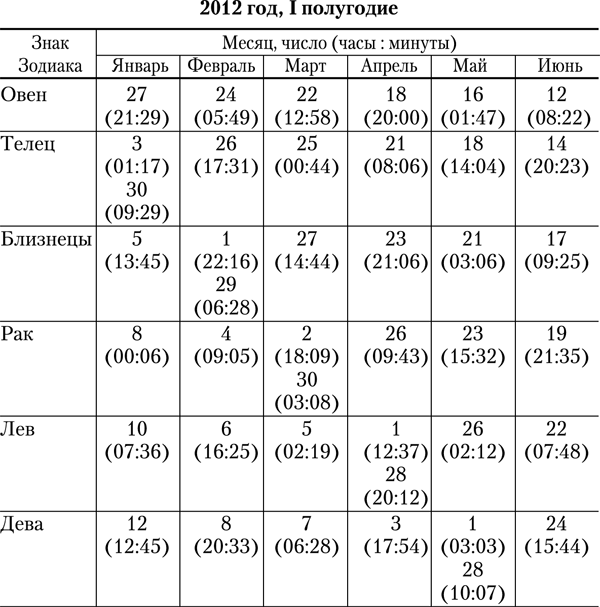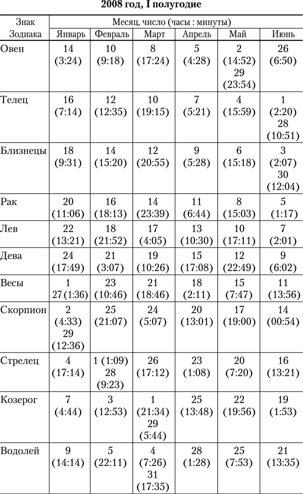 В таблицах указаны месяц, число и время (час: мин) вхождения Луны в знаки Зодиака. Например, в 2008 году 1.01 и 2.01 (до 4:33) Луна находилась в знаке Весов; 2.01 (с 4:33), 3.01 и 4.01 (до 17:14) – в знаке Скорпиона; 4.01 (с 17:14), 5.01, 6.01 и 7.01 (до 4:44) – в знаке Стрельца; 7.01 (с 4:44), 8.01 и 9.01 (до 14:14) – в знаке Козерога; 9.01 (с 14:14), 10.01 и 11.01 (до 21:45) – в знаке Водолея; 11.01 (с 21:45), 12.01, 13.01 и 14.01(до 3:24) – в знаке Рыб и т. д. 27.01 Луна снова входит в знак Весов, 29.01 – в знак Скорпиона, 1.02 – в знак Стрельца и т. д.