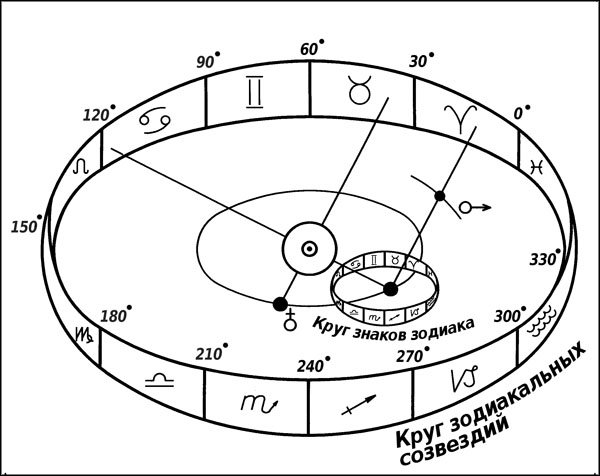 Еще можно сказать, что знаки Зодиака характеризуют собой пространство, в котором находятся планеты, точнее, криволинейную полосу вокруг Земли, на которую проектируются планеты, и зодиакальный круг в этом случае используется для определения координат планет. Эти координаты могут быть абсолютными, выраженными в градусах дуги расстояния от планеты до 0° Овна, или относительными, выраженными в градусах от начала данного знака.