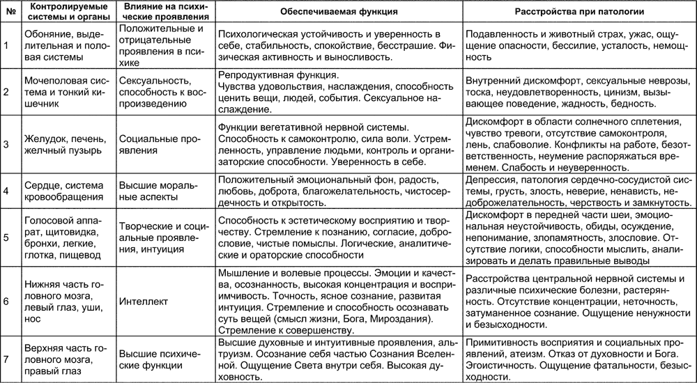 Таблица влияния энергии чакр на личностные, физические и психические процессы