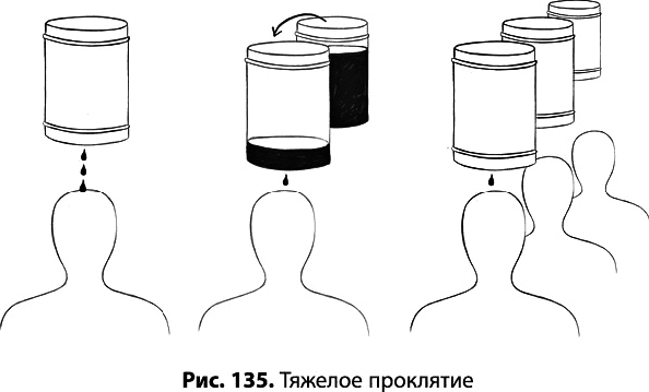 Тяжелое проклятие тяжело и разглядеть. Сделанное специально, оно может пробить все энергетические оболочки до шестой, застряв глубоко и высоко. Такое проклятие спускается к человеку порционно, словно черные капли падают из висящей над головой цистерны с мазутом (рис. 135).