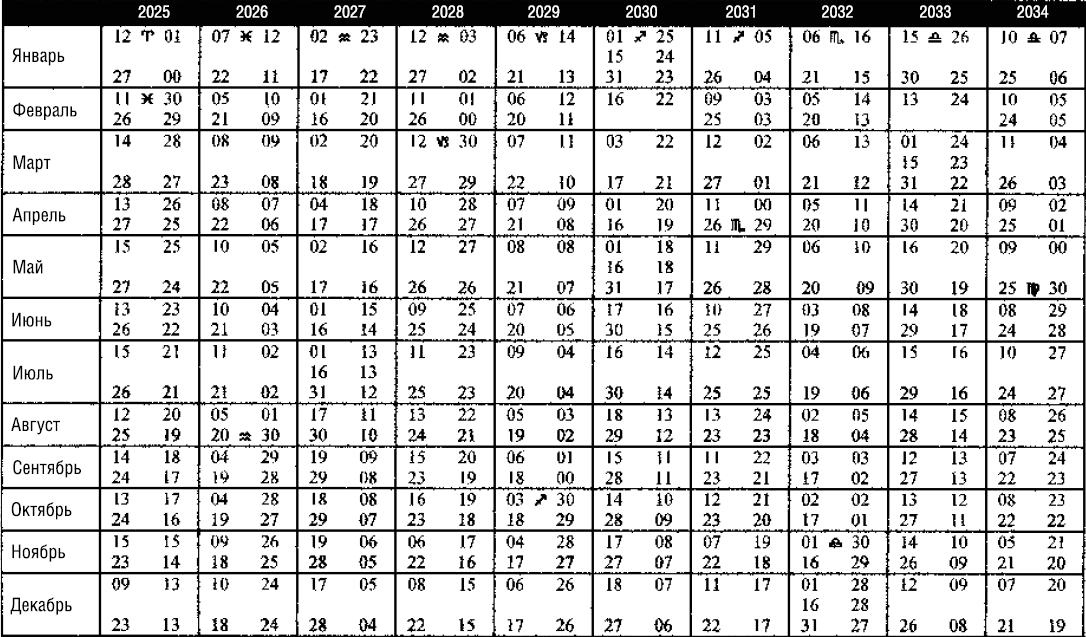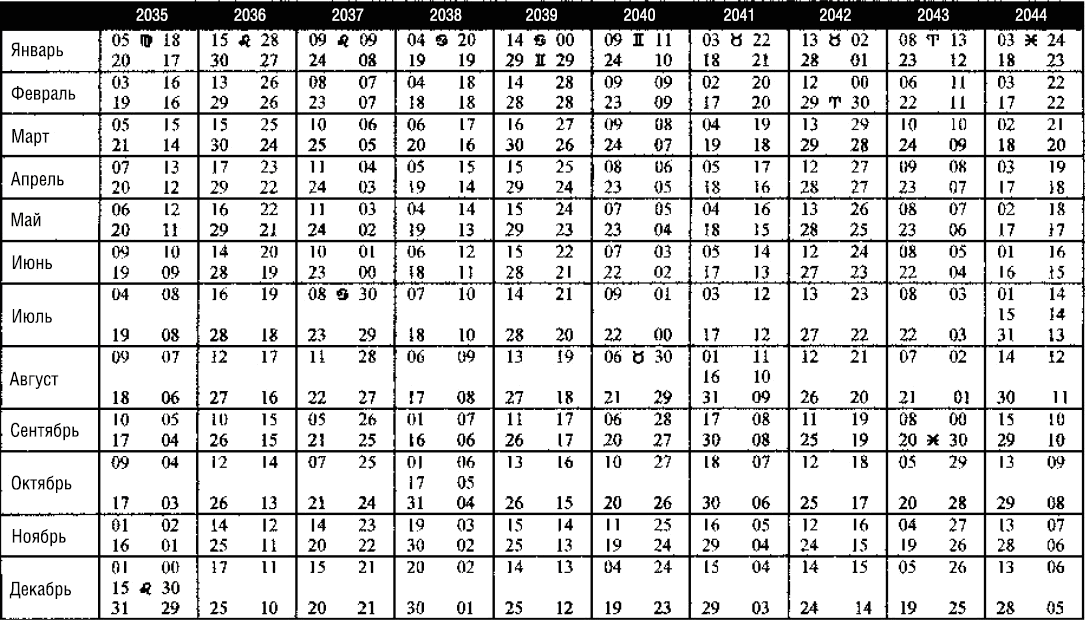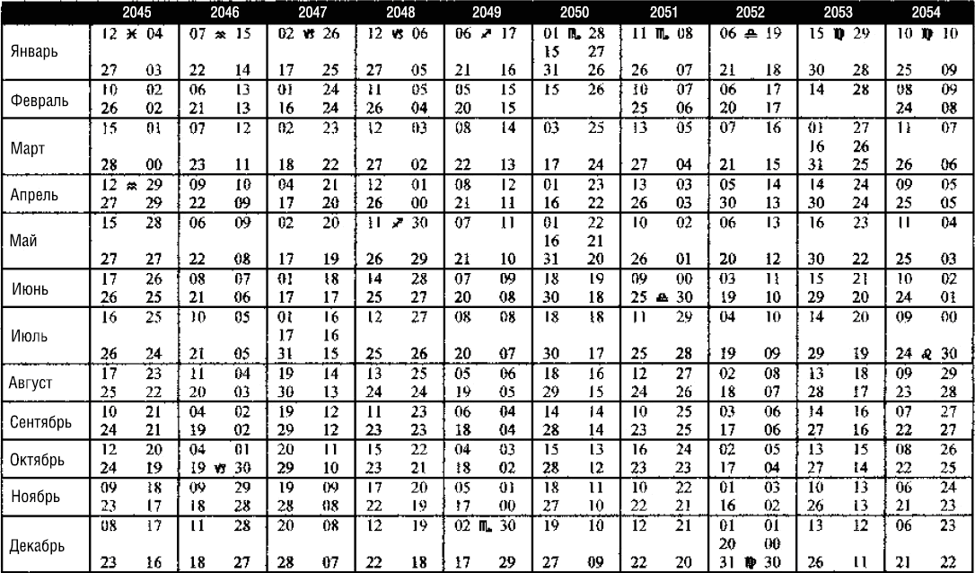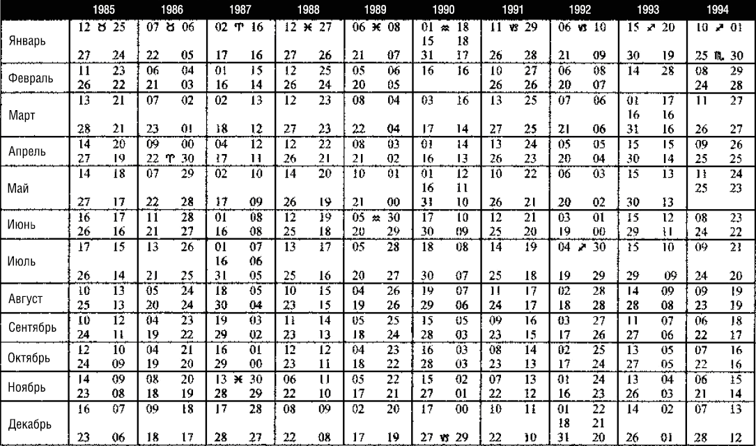 Воспользуйтесь приведенными ниже таблицами и определите знак и градус местоположения Северного узла для любой интересующей вас даты. Найдите ячейку, соответствующую вашему году и месяцу рождения. В этой ячейке цифра слева обозначает день месяца, а цифра справа – градус положения Северного узла. Выберите дату, ближайшую к вашему дню рождения. Затем, если прямо рядом с этой датой не окажется символа знака зодиака, просканируйте взглядом весь столбец вверх, чтобы определить, символ какого знака напечатан последним. Это даст вам знак зодиака и градус Северного узла для любого интересующего вас момента. Южный узел всегда расположен точно в оппозиции к Северному узлу, в том же градусе и в противоположном знаке.
