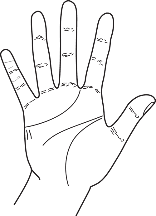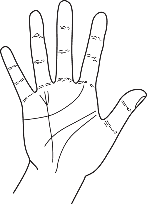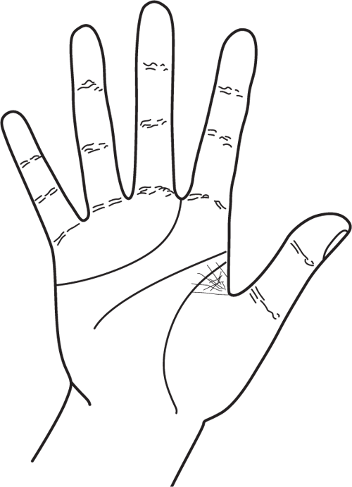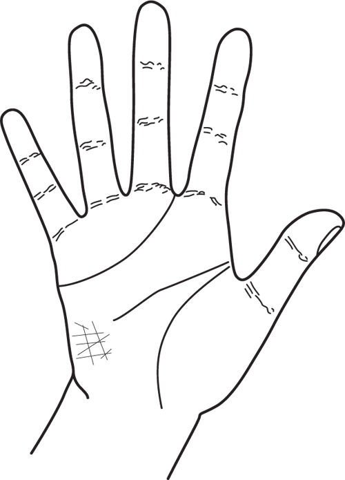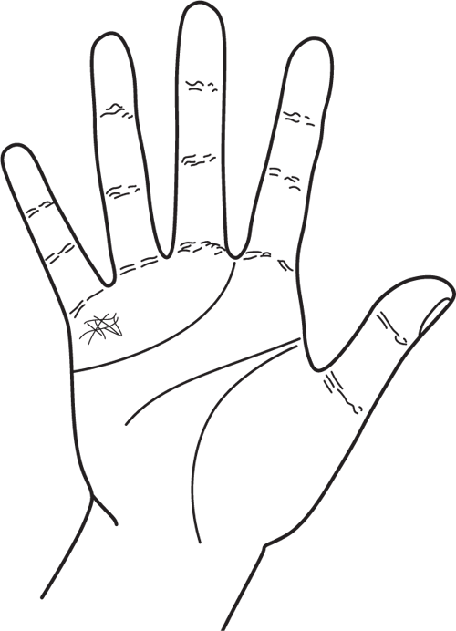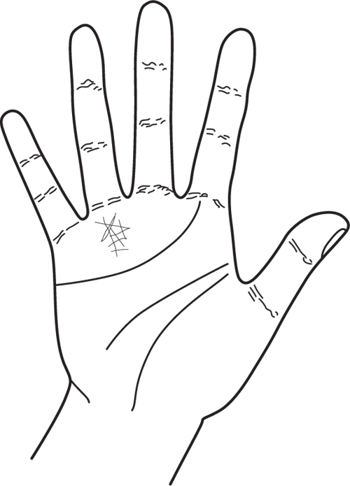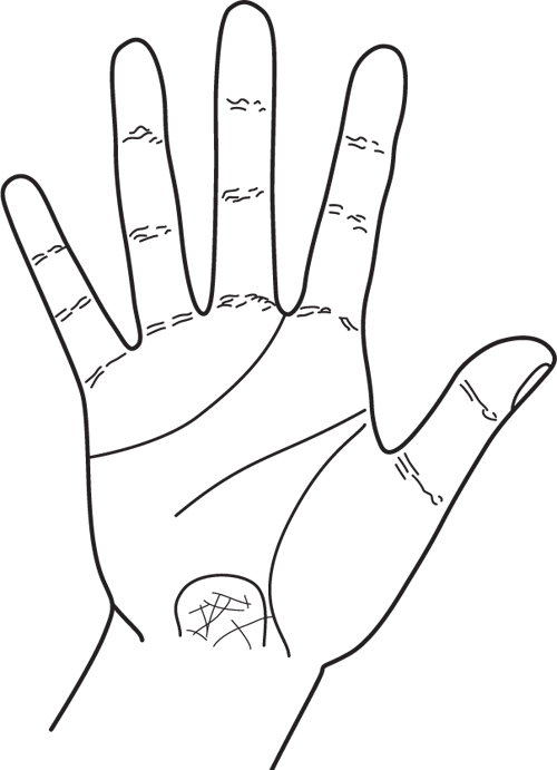 Человек с недостаточно сильным или дисгармоничным Меркурием испытывает трудности с самостоятельным освоением любой новой области. Любовь к пустым слухам и сплетням, неуемное любопытство, привычка к вранью (или воровству), болтливость – все это также признаки того, что Меркурий нуждается в качественной коррекции. Дисгармоничный Меркурий на руках – это искривленный в суставе мизинец, либо низко посаженный короткий мизинец, горизонтальные черты на фалангах пальца Меркурия, плоский либо вдавленный холм Меркурия (область под мизинцем), горизонтальные волнообразные линии на нем, решетка (рис. 31). Линия Меркурия с разрывами, островами, волнообразная либо очень четкая прямая и глубокая (если при этом отсутствует линия Солнца).