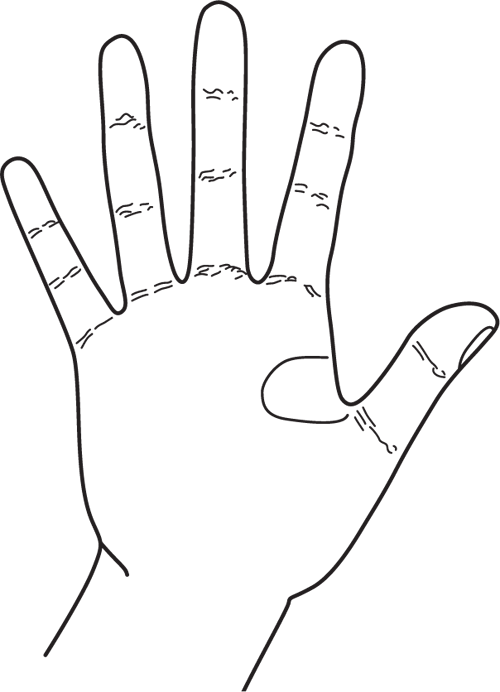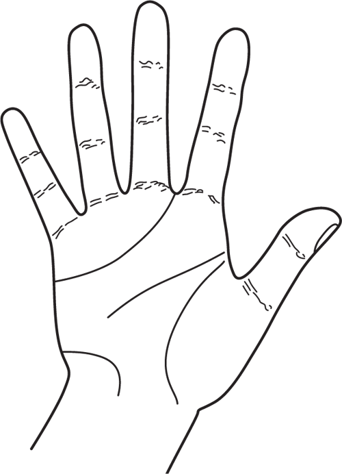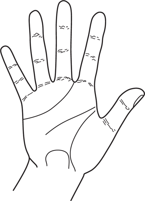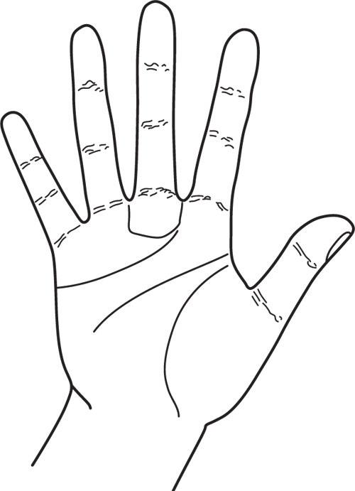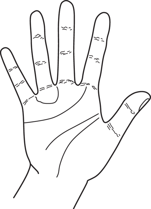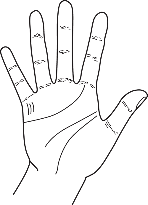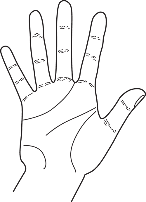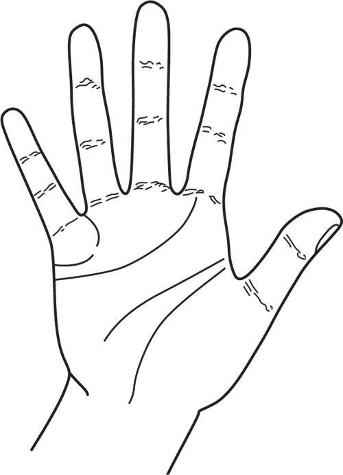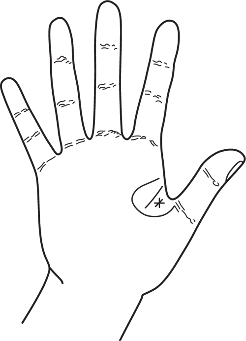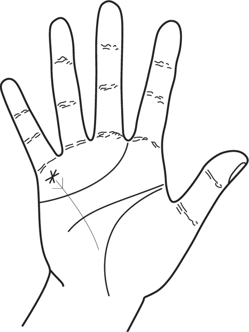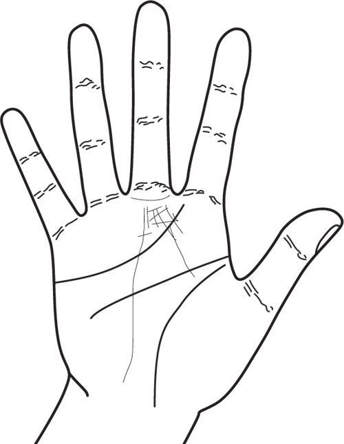 Марс – это, прежде всего, тема самовыражения и самореализации. Расположен он на активной стороне ладони между холмами Юпитера и Венеры (рис. 15). Гармоничный Марс дает смелость, мужество, решительность. Но не агрессивность и не чрезмерную импульсивность. Марс наделяет умением побеждать и себя и обстоятельства, благополучно завершать дела, начатые по собственной инициативе. Хорошо развитый холм выглядит полным, с четкой прямой линией посередине, иногда на нем можно встретить знак «звезды» (самостоятельные перекрещенные короткие линии), что усилит позитивные качества холма (рис. 16). Люди, сделавшие успешную военную, спортивную карьеру, получают на свою руку такой знак.