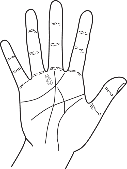 Принять как факт, который станет основой для совершенствования. Ровный холм с одной или двумя вертикалями (как правило, это окончание линии Судьбы) или трезубцем показывает гармонично используемую энергию Сатурна. Положительным знаком является и «петля» между средним и безымянным пальцем, находящаяся на границе холмов Сатурна и Солнца. Ее называют «петлей ответственности» (рис. 22). Это верный сигнал активности энергии Сатурна. И в зависимости от знаков на холме можно понять, как человек решает задачи, связанные с ответственностью, стабильностью, планированием. Линия удачи, вытекающая из линии Жизни и идущая к холму Сатурна – признак финансового успеха ее обладателя.