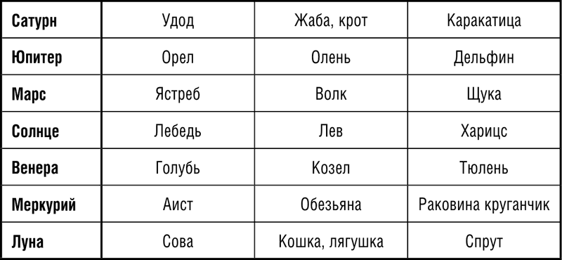 В случае необходимости можно заменить одного из ассистентов собакой, у которой истечение магнетического флюида достаточно сильно. Перья птиц в соотношении с планетами употребляются как крапила для воды, динамизированной магнетическим током. Поэтому мы даем для каждого ассистента растение, птицу, животное и рыбу. Так же как и для прежних соотношений, мы даем список свойств, приписываемых деревенской Магией некоторым из этих животных.