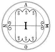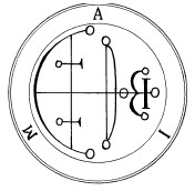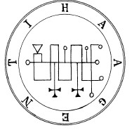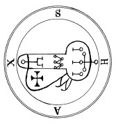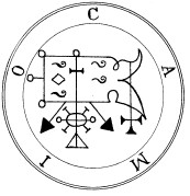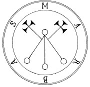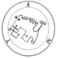 Двадцать второй дух зовется Аим (Aim). Он – Великий Сильный Герцог, появляется в образе человека с очень красивым телом, но с тремя головами; Первая голова – как у змеи, вторая голова – как у человека с двумя звездами на лбу, третья голова – как у теленка. Он едет верхом на гадюке, неся в руке головню, которой он поджигает города, замки и большие селения. Он сделает тебя остроумным во всех смыслах и даст правдивые ответы на личные вопросы. Он управляет 26 Легионами Адских Духов и вот его Печать, которую носят так, как это было описано выше и т. д.