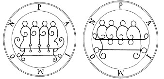 Девятым Духом здесь является Пеймон (Paimon), Великий Король, всецело покорный Люциферу (Lucifer). Он появляется в образе человека с великолепнейшей короной на голове, восседая на одногорбом верблюде. Перед ним шествует толпа Духов, похожих на людей, с трубами, тарелками и другими музыкальными инструментами. У него громкий голос, и он ревет при первом своем появлении, а его речь такова, что Маг может не понять его, пока не заставит выражаться более внятно. Этот Дух может обучить всем искусствам, наукам и разным секретным вещам. Он может открыть тебе, что такое Земля, и как она удерживается на Водах, и что такое Разум и где он находится; и еще он откроет тебе все, что ты пожелаешь узнать. Он дарует достоинство и требует того же. Он обязывает и заставляет любого человека служить магу, если тот этого пожелает. Он дарует хороших друзей, таких, которые могут научить всем искусствам. Его наблюдают на Западе. Он принадлежит к Чину Господств. Он правит 200 легионами Духов, часть из которых принадлежит к Чину Ангелов, а часть – к Чину Сил. Чтобы он появился без них, нужно заставить его явиться, тогда он появится в сопровождении только двух Королей – Лабала (Labal, вариант – Бебал (Bebal)) и Абали (Abali, варианты Абалим (Abalim), Абалам (Abalam)) и также других Духов, из Чина Властей в его воинстве, и это – 25 Легионов. А те Духи, которые подчинены им, не всегда находятся при них, пока маг не заставит их появиться. Вот его Символ, который необходимо носить как Ламен перед собой и т. д.