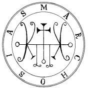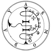 Тридцать второй Дух зовется Асмодей (Asmoday). Он – Великий Король, Сильный и Могущественный. Он появляется с тремя головами: первая – как у быка, вторая – как у человека, третья – как у барана, он также имеет хвост как у змеи и извергает пламя из пасти. Его ноги имеют перепонки как у гуся. Он сидит на Адском Драконе и держит в руках копье со знаменем. Он идет впереди всех, потому что первым избран под власть Амаимона (Amaymon). Когда заклинатель хочет вызвать его, пусть во время операции стоит за границей круга, со снятым головным убором, иначе Амаимон (Amaymon) обманет его и заставит выдать задачу операции. Но как только заклинатель увидит Асмодея (Asmoday) в описанной выше форме, он должен назвать его по имени и спросить: "Ты – Асмодей?". И он не будет отрицать это и поклонится до земли. Он дает Кольцо Силы, он учит искусству арифметики, астрономии, геометрии и всем ремесленным искусствам. Он делает непобедимым. Он показывает место, где лежат сокровища, и охраняет их. Он – из Легионов Амаимона (Amaymon), и он управляет 72 Легионами Адских Духов. Вот его Печать, которую нужно носить как Ламен, на своей груди и т. д.