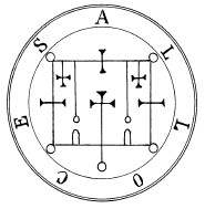 Девятнадцатый Дух зовется Саллос (Sallos) (или Салеос (Saleos)). Он великий и могущественный Герцог, который появляется в образе храброго воина с герцогской короной на голове, сидя верхом на крокодиле, но миролюбивом. Он вызывает любовь женщины к мужчине и мужчины к женщине; и управляет 30 Легионами Духов. Вот его Печать и т. д.