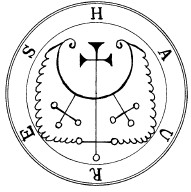 Второй Дух – это Герцог по имени Агреас (Agreas) или Агарес (Agares). Он властвует на Востоке, появляется в образе учтивого старца, верхом на крокодиле с ястребом-тетеревятником на запястье, и он весьма кроток при появлении. Он заставляет бежать стоящих на месте и возвращает назад беглецов. Он обучает всем языкам и языкам прошлого. Он обладает властью лишать как Духовных, так и Светских Званий, к тому же он вызывает землетрясения. Он принадлежал к Чину Сил. Он правит 31 Легионом Духов. Вот его Печать или Символ, который вы должны носить как Ламен, на груди.
