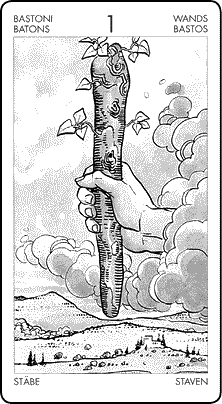 Туз Жезлов – одна массивная ветвь с распускающимися на ней листьями, пустившая побеги на своей верхушке; она появляется из движущейся массы серых и белых облаков. Твердая рука крепко удерживает эту ветвь в воздухе. Чья это рука? Бога? Или Мага, поднимающего свои инструменты со стола? Ниже, у гребня голубых гор, тянущихся вдоль горизонта, в самом сердце зеленой долины находится чье-то уединенное жилище.