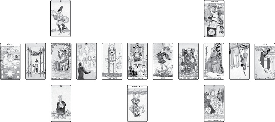 В качестве «персональных» карт нами были выбраны: Королева Пентаклей (олицетворяющая вопрошающую девушку) и Король Жезлов (символизирующий исследуемого начальника компании). Разместив остальные карты по позициям, мы получили следующий вариант расклада.